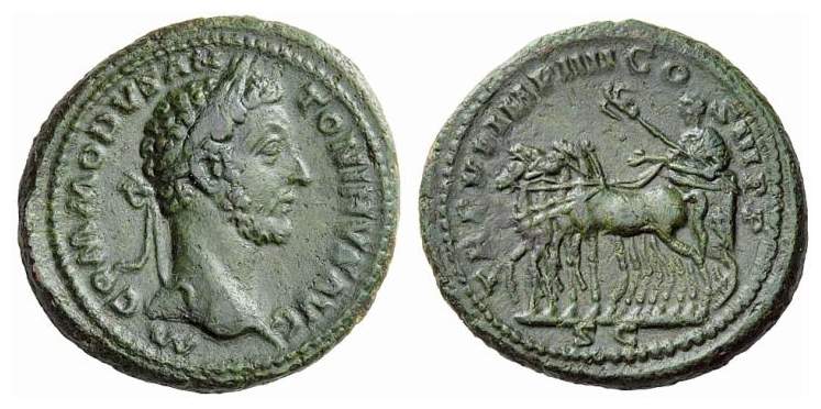 | Gnecchi II 139 | Commodus AE37 Medallion. AD 177. 51.01 g. IMP CAES L AVREL COMMODVS GERM SARM, laureate, draped and cuirassed bust right, aegis on chest / TR POT COS, Marcus Aurelius and Commodus, each holding a branch, driving a quadriga left, Virtus standing before, leading the horses, Victory hovering left above. Gnecchi II 139; Cohen 738; BMC Medallions, Commodus 1. | Text | Image |