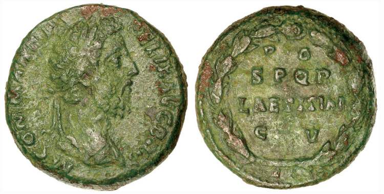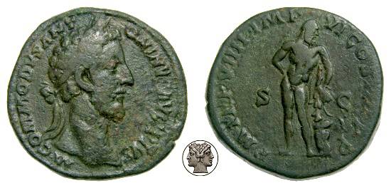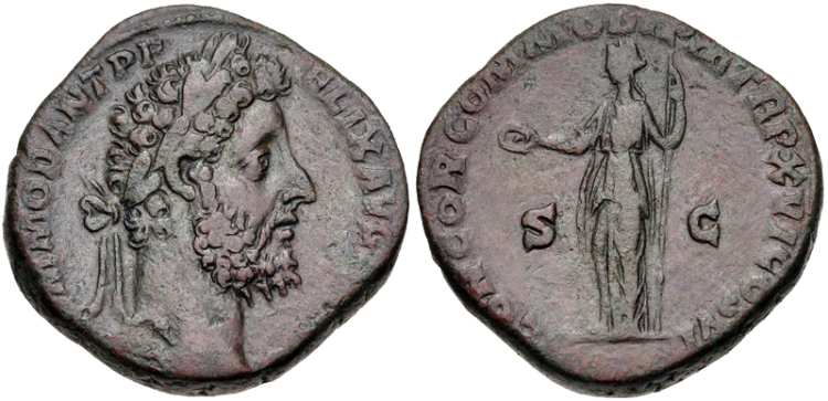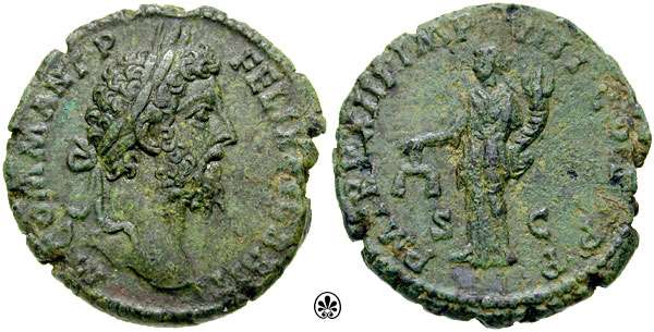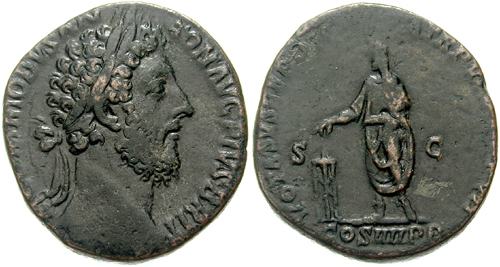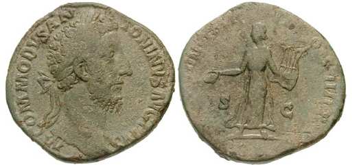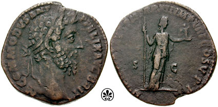 | RIC 1525 [aurelius] | Commodus as Caesar AD 166-177. Sestertius, 30-32mm; 23.64g. AD 175-176. L AVREL COMMODO CAES AVG FIL GERM SARM, bare-headed, draped and cuirassed bust right / IOVI CONSERVATORI, S-C Jupiter, naked but for cloak floating behind him, standing left, holding vertical sceptre and thunderbolt over Commodus who is togate and holding Victory and scroll. RIC 1525 (Marcus Aurelius); BMCRE 1524 var (bust type); Cohen 244. | Text | Image |