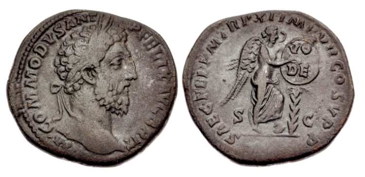 | Gnecchi 80 | Commodus AE medallion, Rome, AD 184-185. 49.52 g. M COMMODVS ANTONINVS AVG PIVS BRIT, laureate, cuirassed bust right / PM TR P X IMP VII COS IIII PP legend, Victory seated right on arms, holding branch and shield inscribed VICT BRIT, trophy to right. Gnecchi II, 80; Cohen 294; BMC Medallions 16. | Text | Image |