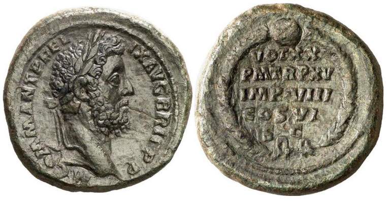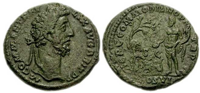 | RIC 1565[aurelius] | Commodus as Caesar, AE sestertius. Rome. AD 166-176. 23.81g). IMP CAES L AVREL COMMODVS GERM SARM, laureate, draped and cuirassed bust right. / TR POT II COS DE GERM S-C, trophy with two bound captives at its base. RIC III 1565; Cohen 92. | Text | Image |