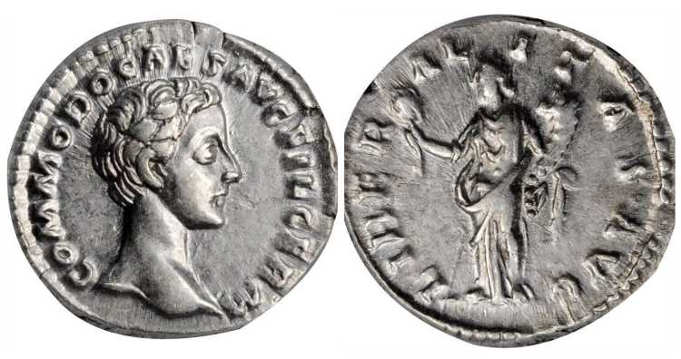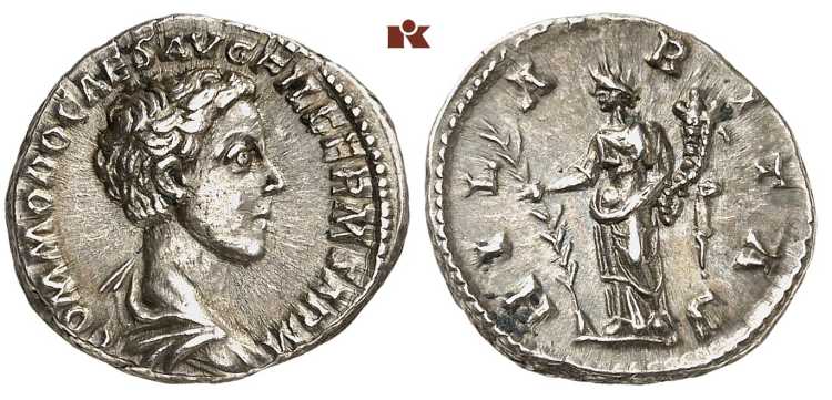 | RIC 599[aurelius] Sear 5545 | Commodus, as Caesar, Denarius. AD 172-175. COMMODO CAES AVG FIL GERM, bare head right / LIBERALITAS AVG, Liberalitas standing left, holding abacus and cornucopiae. RIC III (Marcus Aurelius) 599; RSC 291; BMC IV (Marcus Aurelius) 633; Sear 5545. | Text | Image |