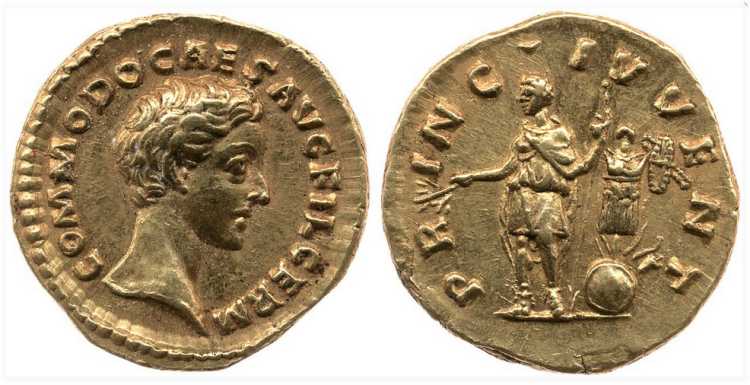 | RIC 600[aurelius] | Commodus as Caesar, AV aureus. AD 172-175. Struck under Marcus Aurelius. COMMODO CAES AVG FIL GERM, bare-headed, draped bust right. / PRINC IVVENT, Commodus standing left, holding branch and sceptre, trophy to right with arms at its base. RIC 600 (Aurelius); BMCRE 637 (this coin); Cohen 605; Sear 5540. | Text | Image |