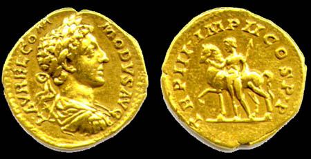 | RIC 604[aurelius] | Commodus, as Caesar, AV Aureus. 175-176 AD. COMMODO CAES AVG FIL GERM SARM, bare headed, draped and cuirassed bust right, seen from behind / ADVENTVS CAES, Commodus on horseback right, right hand raised. Sear 5538; Cohen 1. | Text | Image |