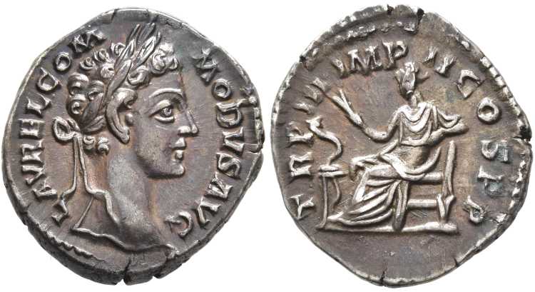 | RIC 649[aurelius] Sear 5702 | Commodus, as Caesar, Denarius. 178 AD. L AVREL COMMODVS AVG, laureate head right / TR P III IMP II COS P P, Salus seated left, feeding serpent rising from altar. RIC 649 corr. Sear 5702, Cohen 762; RSC 762 corr. | Text | Image |
