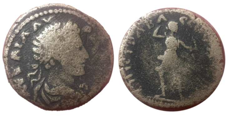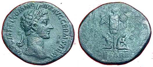 | Tarsos Paris 1241 | Commodus, AE28 of Tarsos, Cilicia. AD 177-192. 12.08 g. AYT KAI AYΡH KOMOΔOC CE, (perhaps with B beneath the bust, for CEB), bare-headed, cuirassed bust right. / AΔΡIANHC TAΡCOY MHTΡOΠOΛEΩC, Athena standing left, holding owl and spear, resting left hand on a shield at her side. Paris 1241; SNG France II 1460; Babelon Paris inventory 610. | Text | Image |