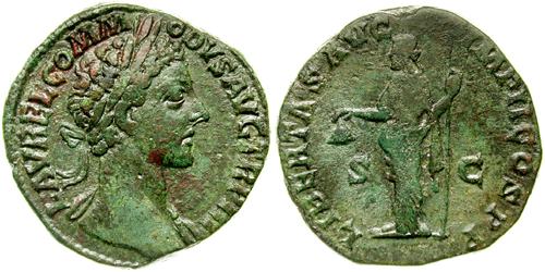 | RIC 1591[aurelius] | Commodus as Caesar, AE Dupondius, struck under Marcus Aurelius. L AVREL COMMODVS AVG TR P III, radiate head right / LIBERTAS AVG IMP II COS P P, S-C, Libertas standing left, holding pileus and sceptre. RIC 1591; Cohen 333. | Text | Image |