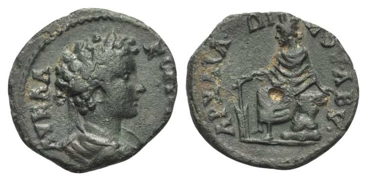 | Tripolis Lydia GRPC Lydia 122 | Commodus as Caesar AE34 of Tripolis, Lydia, AD 166-177. Λ AYT KAICA AYΡ KOMOΔO, bare-headed, draped and cuirassed bust right / TΡIΠOΛEITΩN, Leto hurrying left, looking back, holding the infants Artemis and Apollo in her arms. GRPC Lydia 122 otherwise unpublished. CNG 160, 206. | Text | Image |