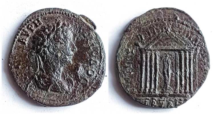 | Tarsus SNG Fr 1456 | Commodus and Annius Verus, Caesars, AE16mm of Tarsus, Cilicia. KOΡOI-CEBACTO[Y], bare-headed and draped bust of Commodus right, facing bare-headed and draped bust of Verus left; star above, crossed club and caduceus between / Decastyle temple set on three-tiered base; KOINOC KIΛIKΩN in entablature; three birds in pediment. | Text | Image |