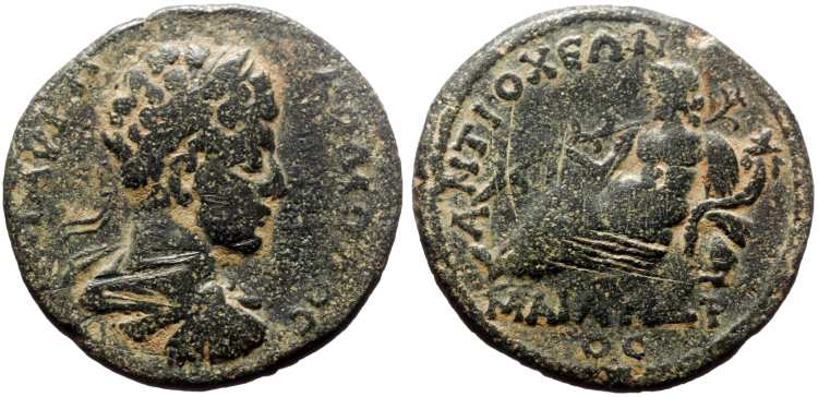| Silandos Paris 1358 SNG vA 8265 var | Commodus, AE43 medallion of Silandus, Lydia. Magistrate Tatianos. Struck ca AD 177. AVTO KAI Λ AVΡH KOMOΔOC, beardless, laureate, draped and cuirassed bust right / EΠI AΡXIEΡOC TATIONOY CIΛANΔEΩN AΡX around and beneath Commodus, holding sceptre, driving biga left; Nike flying right above, crowning him with wreath. SNG von Aulock 8265 var (rev. legend configuration); Mionnet IV, 818; Paris 1358; GRPC Lydia 61. | Text | Image |