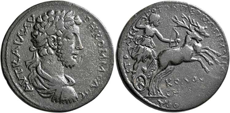 | Sillyum SNG vA 4873 | Commodus, AE35 of Sillyum, Pamphylia. AD 175-177. 25.45 g. AYT KAICAΡ Λ AYΡH KOMOΔOC, laureate, draped and cuirassed bust right. / CIΛΛYEΩN, Mên, wearing Phrygian cap and with crescent on shoulders, on horseback riding right. SNG von Aulock 4873 (this coin); Franke KZR 431. | Text | Image |