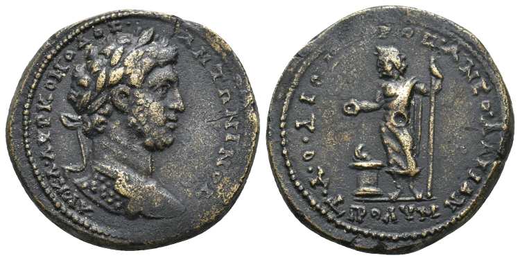 | Troezen BMC 21 | Commodus, AE24 of Troezen, Argolis. AD 177-192. 9.54 g. M AYΡ KOMMOΔOC AN, laureate, draped and cuirassed bust right. / TΡOIZHNIωN, Tyche standing left by altar, holding patera and cornucopiae. BMC 21; Paris 233; BCD Peloponnesos 1341.1 (this coin). | Text | Image |