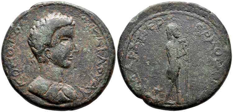 | Tralleis BMC 155 | Commodus, AE18 of Tralles, Lydia. AD 177-192. Λ AYΡH KOMOΔOC, laureate, draped and cuirassed bust right / TΡAΛΛIANΩN, Apollo, naked but for chlamys, running left, looking right, holding bow and reaching for an arrow from a quiver at his shoulder. BMC 155; Mionnet Supp. VII, 731; Paris 1689; GRPC Lydia 259. | Text | Image |
