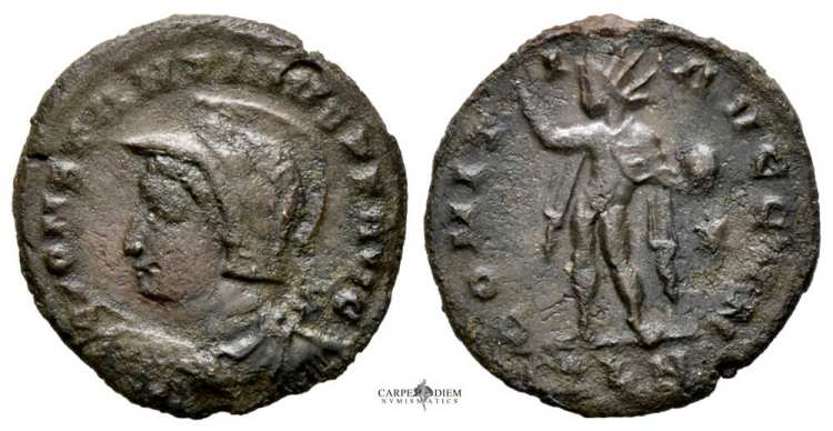 | Trier RIC VII 134 | Constantine I, AE Follis. 317 AD. CONSTANTINVS PF AVG, laureate, draped, cuirassed bust right. / SOLI INVIC-TO COMITI, Sol standing left, chlamys across left shoulder, holding globe and raising right hand, T-F across fields. Mintmark dot ATR. | Text | Image |
