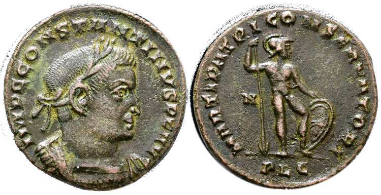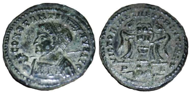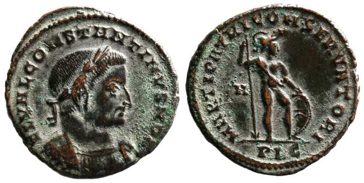 | Trier RIC VII 213, plain | Constantine I AE Follis. Trier. IMP CONSTAN-TINVS MAX AVG, helmeted, laureate, cuirassed bust right. / VICTORIAE LAETAE PRINC PERP, two Victories holding shield inscribed VOT PR over altar. Altar type Helvetica 4b (plain altar). Mintmark STR. RIC VII 213. | Text | Image |