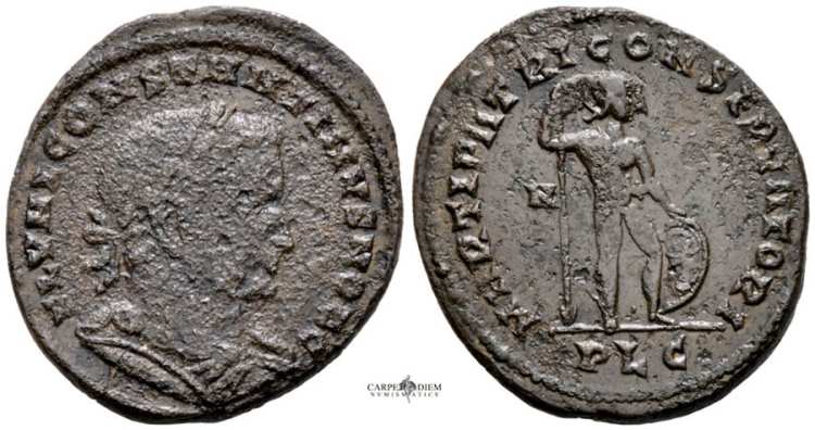 | Trier RIC VII 549 | Constantine I AE follis. CONSTANTINVS MAX AVG, laurel-and-rosette diademed, draped, cuirassed bust right. / GLORIA EXERCITVS, two soldiers holding spears and shields, two standards between them, wreath between standards. Mintmark TRP. | Text | Image |