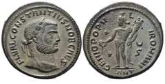 | London RIC VI 20 | Constantius I, as Caesar, AE Follis. FL VAL CONSTANTIVS NOB C, laureate and cuirassed bust right / GENIO POPV-LI ROMANI, Genius standing left, holding patera and cornucopiae. | Text | Image |