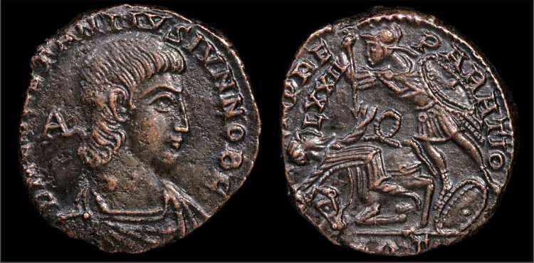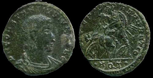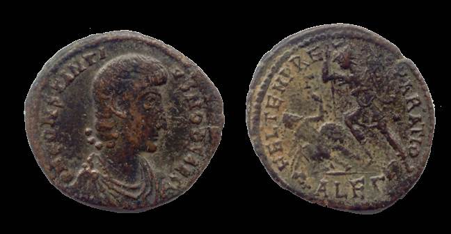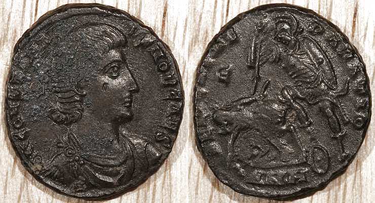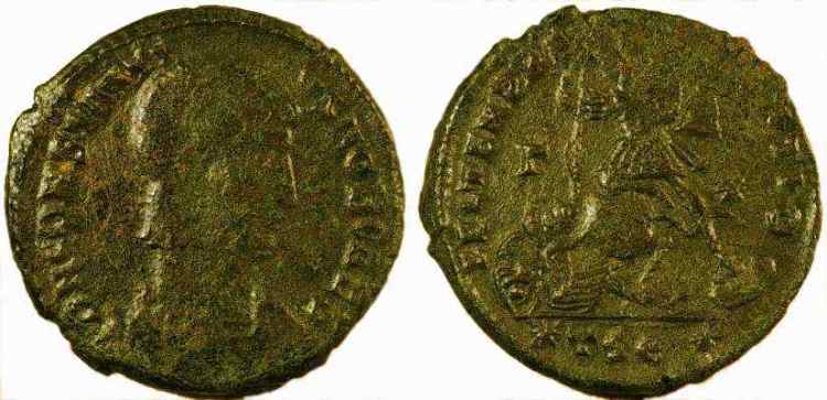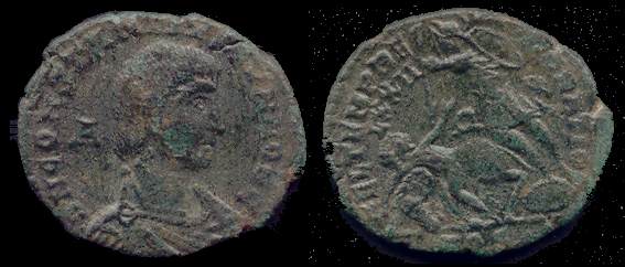 | Antioch RIC VIII 137, A | Constantius Gallus, AE22. Antioch. DN CONSTANTI-VS NOB CAES, bare-headed, draped, cuirassed bust right / FEL TEMP RE-PARATIO, soldier standing left, spearing fallen horseman who is bearded, hair in braids, clutching horse's neck.Γ in left field. Mintmark ANA. RIC VIII Antioch 137. | Text | ![]() |