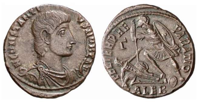 | Aquileia RIC VIII 189 | Constantius Gallus AE22. D N CONSTANTIVS IVN NOB C, bare-headed, draped and cuirassed bust right; A behind bust / FEL TEMP REPARATIO, soldier spearing fallen horseman who is bare-headed, reaching backwards; LXXII in left field, AQP in ex. | Text | ![]() |