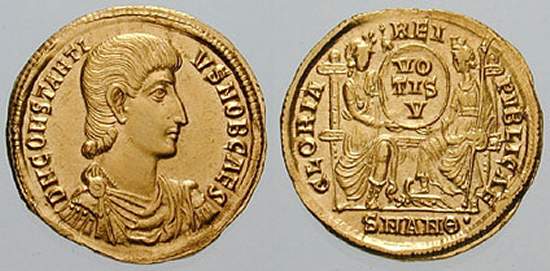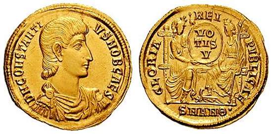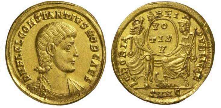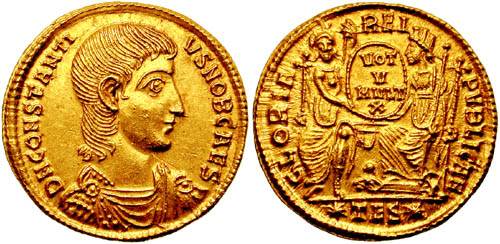 | Antioch RIC VIII 90 | Constantius Gallus, Caesar, AV Solidus. D N CONSTANTIVS NOB CAES, bare-headed, draped and cuirassed bust right / GLORIA REIPVBLICAE, Roma and Constantinopolis seated facing, supporting between them shield inscribed VO-TIS-V in three lines. Mintmark SMANΘ dot. | Text Text | ![]() ![]() |