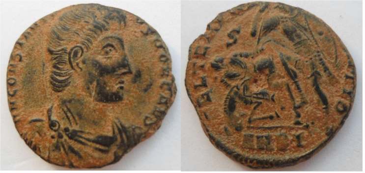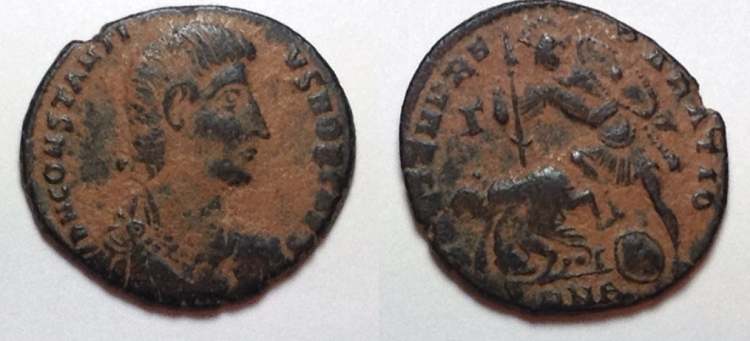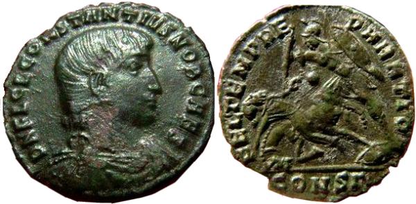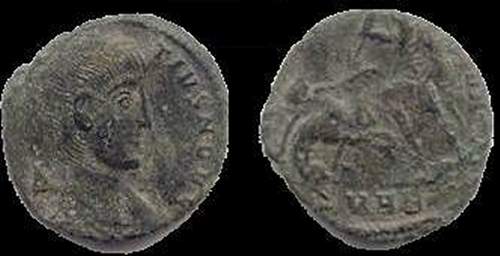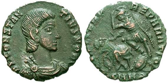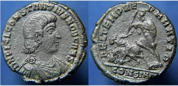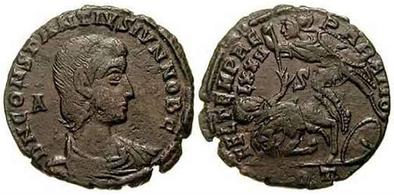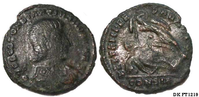 | Constantinople RIC VIII 113v, I | Constantius Gallus AE3 20mm. DN FL CL CONSTANTIVS NOB CAES, bare-headed, draped, cuirassed bust right, Δ behind head / FEL TEMP R-EPARATIO, soldier spearing fallen horseman who is unbearded, wearing Phrygian helmet, clutching horse's neck. B in left field, dot in centre. Mintmark CONSI. RIC VIII Constantinople 113 var (unlisted officina). | Text | ![]() |