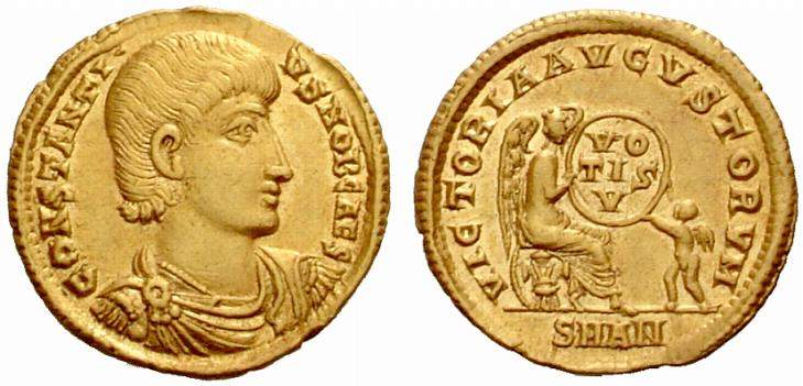 | Antioch RIC VIII 95 | Constantius Gallus, AV Semissis of Antioch. 17mm, 2.27 g. CONSTANTIVS NOB CAES, bare-headed, draped, cuirassed bust right / VICTORIA AVGVSTORVM, Victory seated right on cuirass, holding a shield inscribed VO-TIS V on her knee, at foot a small genius helping to support the shield. Mintmark SMAN. RIC VIII Antioch 95. | Text | ![]() |