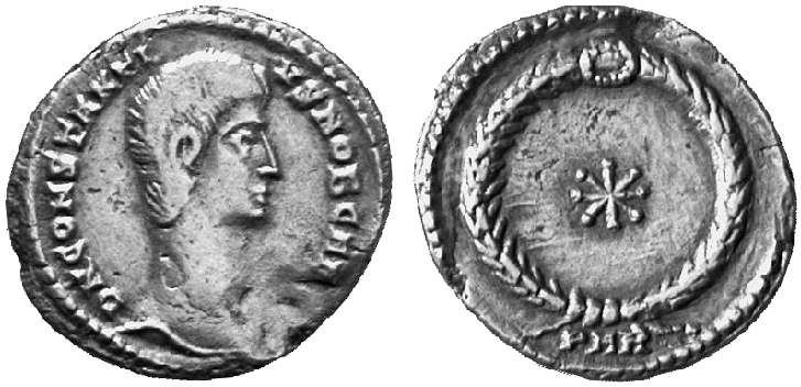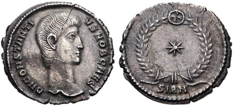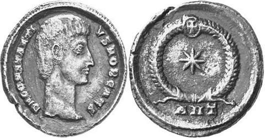 | Sirmium CNG 289, 402 | Constantius Gallus, AR Siliqua of Sirmium. AD 351-354. 20mm, 2.73 g. DN CONSTANTIVS NOB CAES, bare head only, right / No legend, star within wreath. Mintmark SIRM. Not in RIC or RSC. Unpublished. CNG 289, 402. | Text | ![]() |