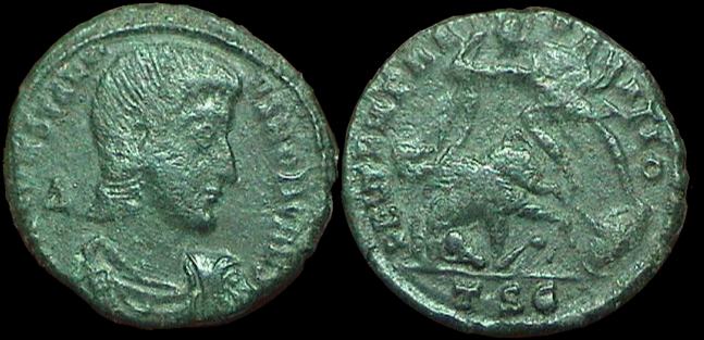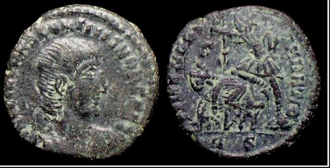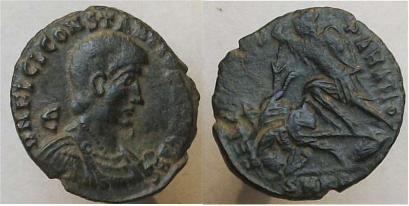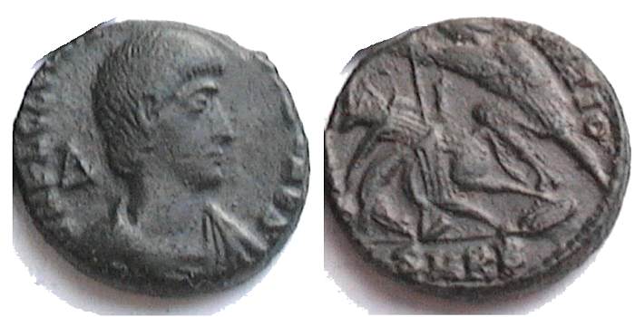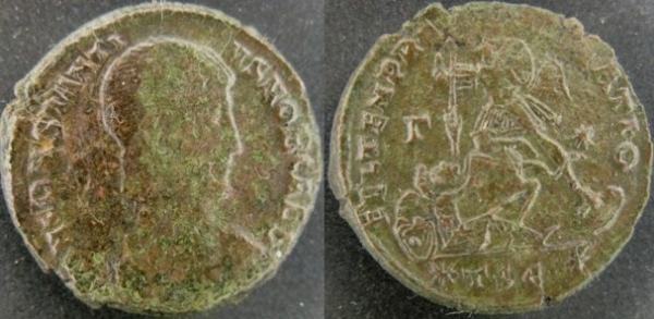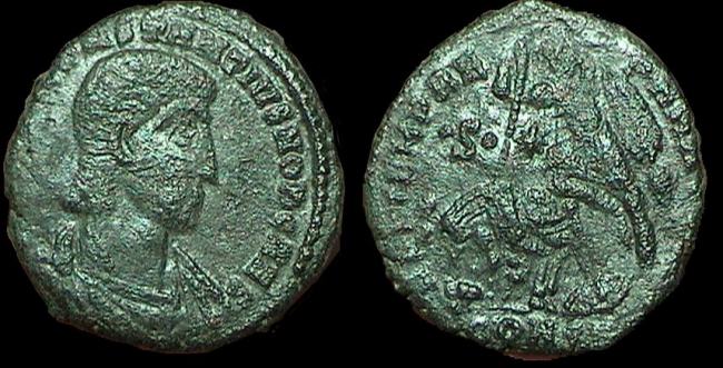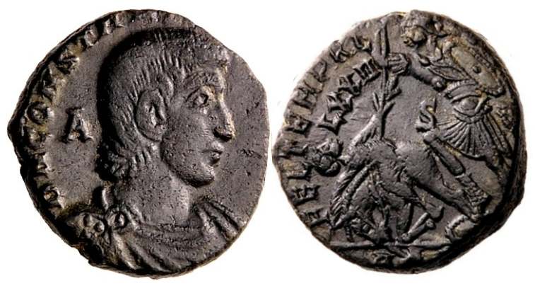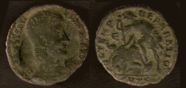 | Heraclea RIC VIII 91, Δ var | Constantius Gallus, AE3 of Heraclea. DN CONSTAN-TIVS NOB C, bare-headed, draped, cuirassed bust right / FEL TEMP-REPARATIO, soldier standing left, spearing fallen horseman who is unbearded, wearing a brimmed helmet, reaching backwards. Mintmark SMH Δ. RIC VIII Heraclea 91 var (horseman's headwear). | Text | ![]() |