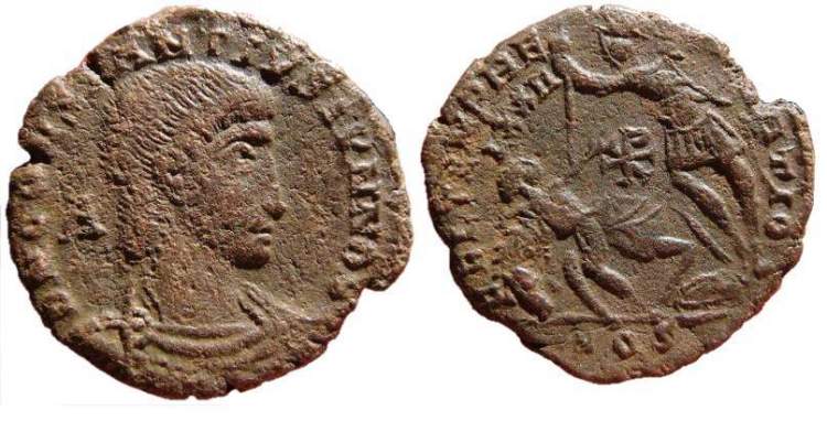 | Sirmium RIC VIII 24 | Constantius Gallus. AE4, Sirmium. DN CONSTANTIVS IVN NOB C, bare-headed, draped, cuirassed bust right, A behind bust / HOC SIGNO VICTOR ERIS, Emperor, diademed and in military dress, facing, head turned left, holding standard with chi-rho on banner and transverse spear. To the right stands Victory, crowning him with a wreath and holding a palm branch. III in left field. Mintmark Star SIRM. RIC VIII Sirmium 24. | Text | ![]() |