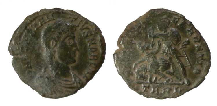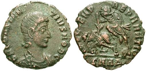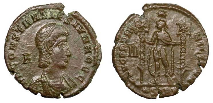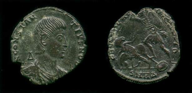| RIC VIII Heraclea 87, Δ | Constantius Gallus, AE3 of Heraclea. DN CONSTAN-TIVS NOB C, bare-headed, draped, cuirassed bust right, Δ behind head / FEL TEMP RE-PARATIO, soldier spearing fallen horseman who is reaching backwards, bearded, hair in braids. Mintmark SMHΔ. RIC VIII Heraclea 87. | Text | ![]() |