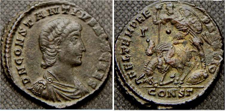 | Constantinople RIC VIII 107, Γ var | Constantius Gallus, AE3 of Constantinople. DN CONSTANTIVS NOB CAES, bare-headed, draped, cuirassed bust right / FEL TEMP RE-PARATIO, soldier standing left, knee raised, spearing fallen horseman who is wearing a Phrygian helmet, clutching horse's neck. Left field: Γ. Centre: Dot. Mintmark: CONSΓ. RIC VIII Constantinople 107 var (obv. legend). | Text | ![]() |