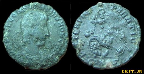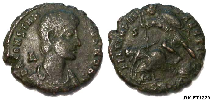 | Constantinople RIC VIII 122 var (5) | Constantius Gallus, AE3. Constantinople. AD 347-355. DN FL CL CONSTANTIVS NOB CAES, bare-headed, draped, cuirassed bust right / FEL TEMP RE-PARATIO,who is unbearded, wearing a Phrygian helmet, reaching backwards. Dot in centre. Mintmark CONSA. RIC VIII Constantinople 122 var. (horseman headwear). | Text | ![]() |