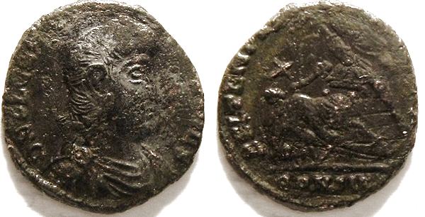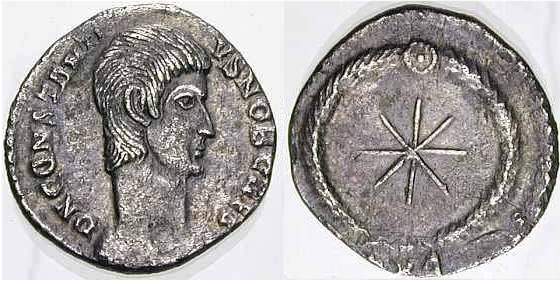 | Lyons RIC VIII 181 | Constantius Gallus, AR Siliqua. Lyons. AD 353-355. DN CONSTANTIVS NOB CAES, bare head only, right / No legend, large star within wreath. Mintmark LVG. RIC VIII Lyons 181. | Text | ![]() |