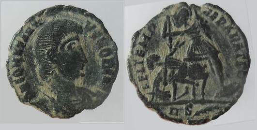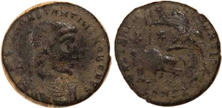 | Aquileia RIC VIII 198, S | Constantius Gallus AE22. D N CONSTANTIVS IVN NOB C, draped and cuirassed bust right, A behind / FEL TEMP RE-PARATIO, soldier spearing fallen horseman who is bare-headed, reaching backwards, LXXII to left, wreath in centre. Mintmark AQS. | Text | ![]() |