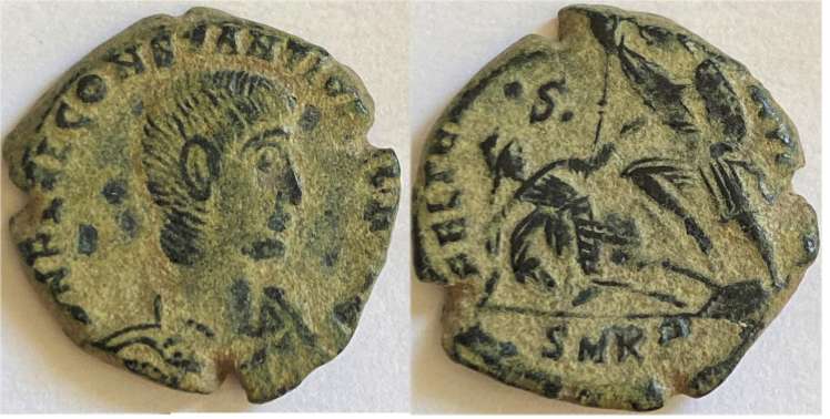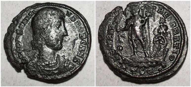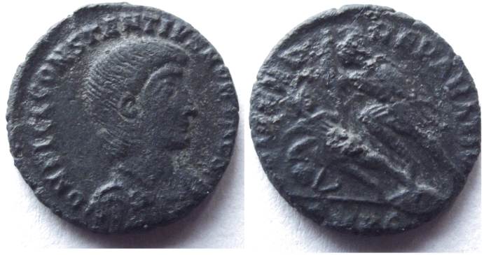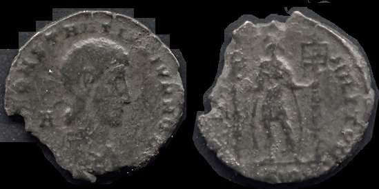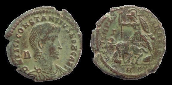 | Siscia RIC VIII 308 var, Γ | Constantius Gallus, AE3 of Siscia. AD 351. DN CONSTAN-TIVS IVN NOB C, bare-headed, draped, cuirassed bust right, A behind head / CONCORDIA-MILITVM, emperor standing front, looking left, holding labarum in each hand. No fieldmark. Mintmark ΓSIS dot. RIC VIII Siscia 308 var (officina letter and no fieldmark). | Text | ![]() |