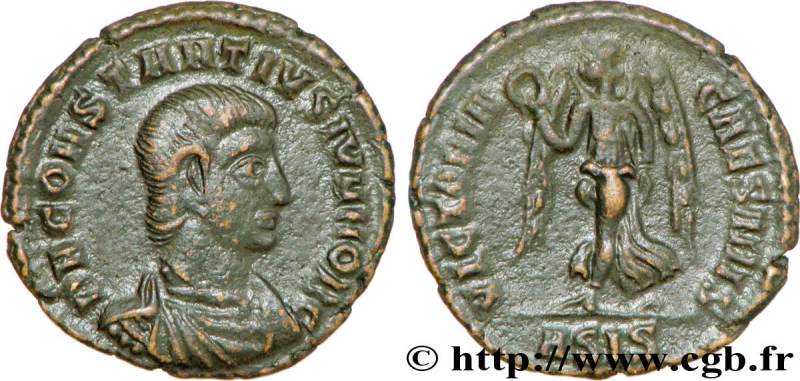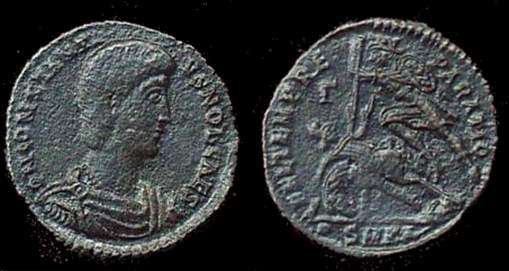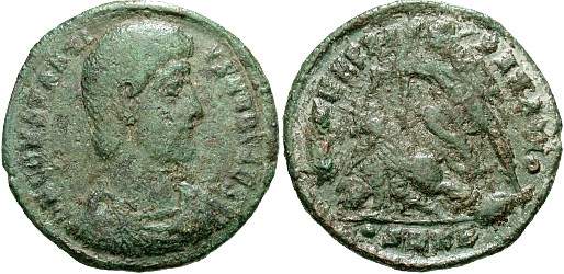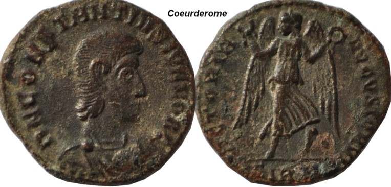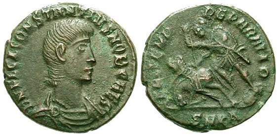 | Sirmium RIC VIII 25 ADD | Constantius Gallus, AE follis. Sirmium. DN CONSTANTIVS IVN NOB C, bare-headed, draped, cuirassed bust right. / VICTORIA AVGVSTORVM, Victory walking left, holding two wreathes. Mintmark SIRM. RIC VIII Sirmium 25 var (this reverse for Constantius II). | Text | ![]() |