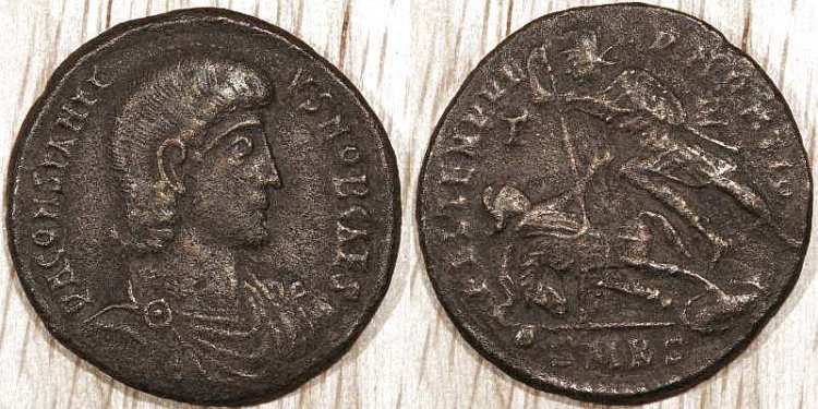 | Heraclea RIC 91, Γ | Constantius Gallus, AE19 mm. DN CONSTAN-TIVS NOB C, bare-headed, draped, cuirassed bust right / FEL TEMP-REPARATIO, soldier spearing fallen horseman who is wearing a Phrygian helmet, reaching backwards. Mintmark: SMHΓ. | Text | ![]() |