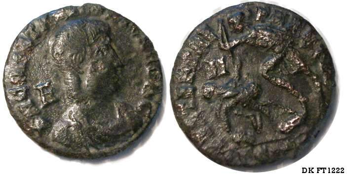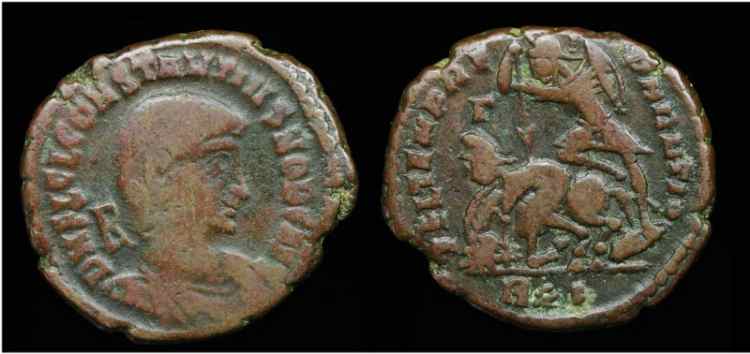 | Arles RIC VIII 213 | Constantius Gallus, AE20, Arles mint. DN CONSTANTI-VS NOB CAES, bare-headed, draped, cuirassed bust right / FEL TEMP R-EPARATIO, soldier spearing fallen horseman who is wearing a Phrygian helmet, reaching backwards. Mintmark TARL. RIC VIII Arles 213. | Text | ![]() |