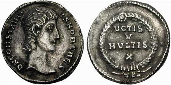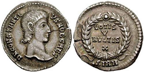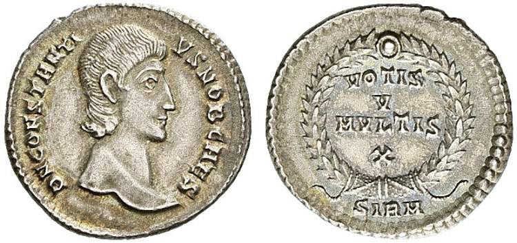 | Sirmium RIC VIII 18 | Constantius Gallus AR Siliqua. D N CONSTANTIVS NOB CAES, bare-headed bust right, seen from behind / VOTIS-V-MVLTIS-X in four lines across field; all within wreath. Mintmark dot SIRM. RSC 56c. | Text | ![]() |