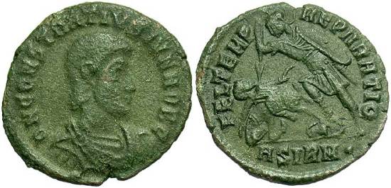 | Siscia RIC VIII 351, B var | Constantius Gallus. 351-354 AD. DN CONSTANTIVS IVN NOB C, bare head bust right, draped and cuirassed / FEL TEMP-REPARATIO, soldier spearing fallen horseman, who is wearing a wide-brimmed helmet, reaching backwards. Mintmark BSIS. RIC VIII Siscia 351 var (horseman's headwear) | Text | ![]() |