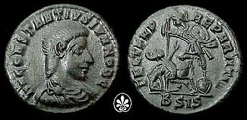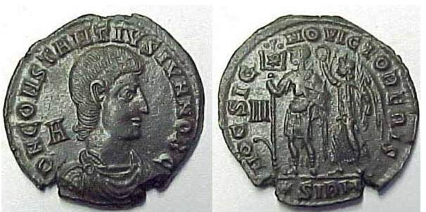 | Sirmium RIC VIII 34, A | Constantius Gallus. AE3. Sirmium. DN CONSTANTIVS IVN NOB C, bare-headed, draped, cuirassed bust right,Δ behind head / CONCORDIA-MILITVM, emperor, diademed and in military dress, standing facing, head left, holding standard with chi-rho banner in each hand, star above. Mintmark ASIRM. RIC VIII Sirmium 34. | Text | ![]() |
