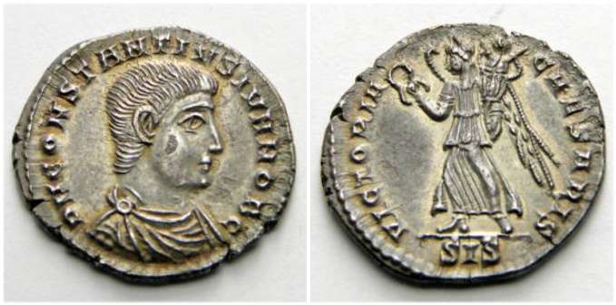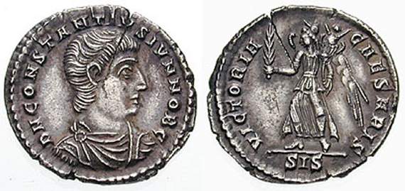 | Siscia RIC VIII 299 | Constantius Gallus AR Siliqua. D N CONSTANTIVS IVN NOB C, bare-headed, draped and cuirassed bust right / VICTORIA CAESARIS, Victory walking left, holding palm and trophy. Mintmark SIS. RSC 45. | Text | ![]() |