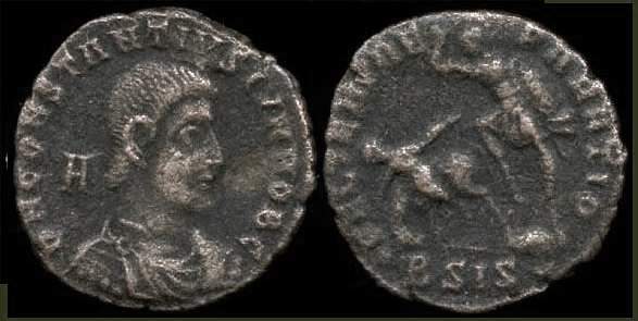 | Siscia RIC VIII 351, B | Constantius Gallus. 351-354 AD. DN CONSTANTIVS IVN NOB C, bare head bust right, draped and cuirassed / FEL TEMP-REPARATIO, soldier spearing fallen horseman, who is wearing Phrygian helmet, reaching backwards. Mintmark BSIS. | Text Text | ![]() ![]() |