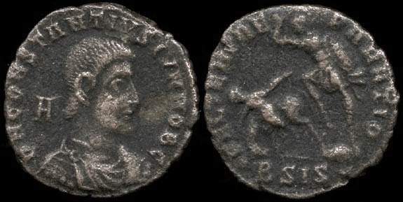 | Siscia RIC VIII 314 | Constantius Gallus. AE4. Siscia. DN CONSTANTIVS IVN NOB C, bare-headed, draped, cuirassed bust right / VICTORIA-AVGVSTORVM, Victory walking left holding wreath in each hand. Mintmark ΓSIS or ΔSIS. RIC VIII Siscia 314. | Text | ![]() |