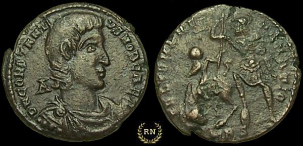 | Trier RIC VIII 354 | Constantius Gallus, AE3. DN CONSTANTI-VS NOB CAES, bare-headed, draped, cuirassed bust right, A behind bust / FEL TEMP RE-PARATIO, soldier spearing fallen horseman who is bare-headed, reaching backwards. TRS in ex. RIC VIII Trier 354. | Text | ![]() |