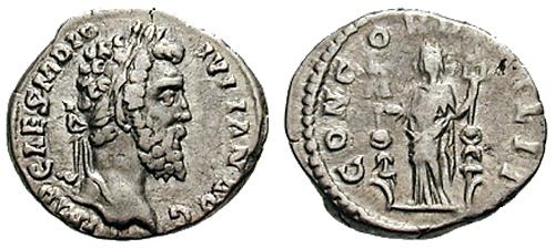 | RIC 1 Sear5 6072 | Didius Julianus AR Denarius. 193 AD. IMP CAES M DID IVLIAN AVG, laureate head right / CONCORDIA, Concordia standing left holding legionary eagle and standard. RSC 2. | Text | Image |