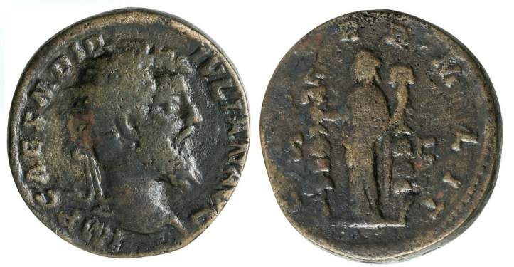 | RIC 11 Sear 6078 | Didius Julianus AE Dupondius. IMP CAES M DID IVLIAN AVG, radiate head right / CONCORD MILIT S-C, Concordia standing front, head left, holding legionary eagle and standard. | Text | Image |