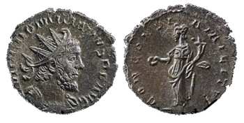 | No ref. | Domitianus, British Usurper, Antoninianus, 271 AD. IMP C DOMITIANVS PF AVG, radiate, cuirassed bust right / CONCORDIA MILITVM, Concordia standing left, holding patera and cornucopiae. | BBC Text | Image |