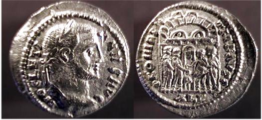 Alexandria RIC 7a var(2) | Domitius Domitianus, AR argentius, Alexandria, in the name of Diocletian. AD 295, 3.24 g. DIOCLETIANVS AVG, laureate head right, with facial features of Domitius Domitianus. / PROVIDENTIAE AVGG, four tetrarchs sacrificing over a tripod before the archway of a six-turreted enclosure. A in left field. Mintmark ALE. Type RIC VII 7a var (fieldmark). | Text | Image |