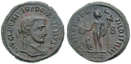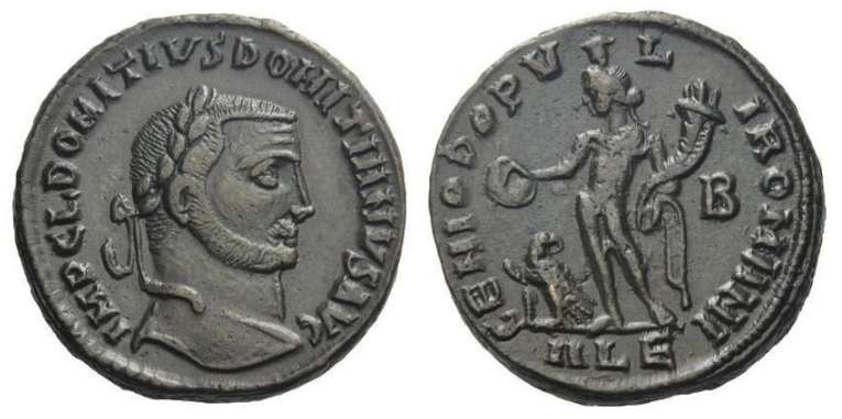 Alexandria | Domitius Domitianus AE Follis. Alexandria mint. IMP C L DOMITIVS DOMITIANVS AVG, laureate head right / GENIO POPV-L-I ROMANI, Genius standing left, modius on head, holding patera in right hand, cornucopiae in left, eagle at feet left; B in right field, mintmark ALE. Cohen 1; RIC 20; Sear 12980. | Text | Image |