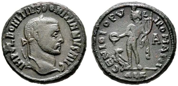 Alexandria RIC 20, A | Domitius Domitianus, AE follis, Alexandria. 10.46 g. IMP CL DOMITIVS DOMITIANVS AVG, laureate head right / GENIO POPVLI ROMANI, Genius standing left, modius on head, holding patera and cornucopiae, eagle at foot left. A in right field. Mintmark ALE. RIC 20; Sear 12980. | Text | Image |